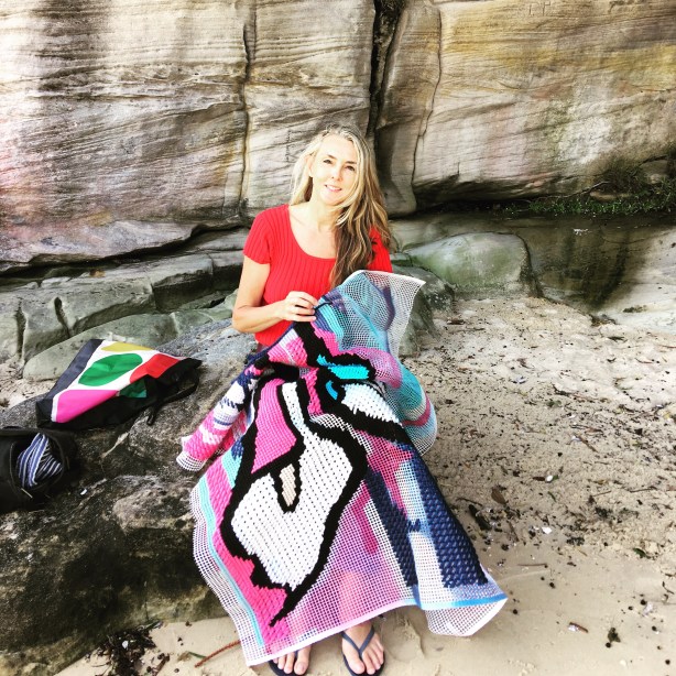 100 x 120cm – 3.75ct tapestry canvas – maximizing the stitches to reveal the spray painted background. On exhibition in November at the Barometer Gallery in Paddington as part of the Seed Stitch Collective.